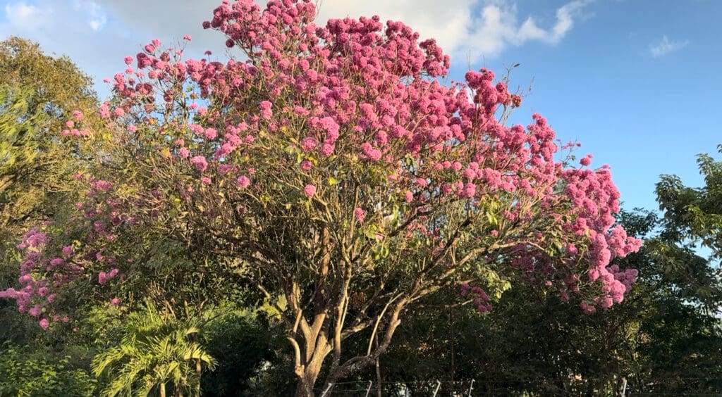 O retiro também me pediu que voltasse o olhar para a natureza — esse templo sem paredes onde tudo anuncia, ainda que em sussurros, a grandeza do Criador. Entre tantas criaturas, foi um ipê-rosa que me capturou. Estava em flor. Entre poucas folhas, as muitas flores explodiam em cor, como se não coubessem mais dentro de si. Um espetáculo silencioso e gratuito, como só a natureza sabe oferecer.