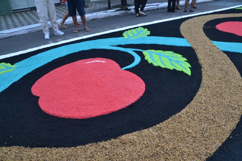 Já os tapetes que dão o colorido típico da data às ruas também é uma tradição católica herdada de Portugal.