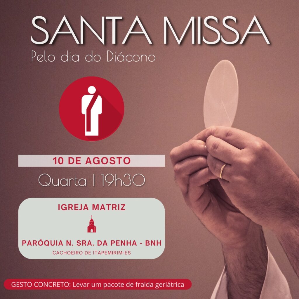 No dia 10 de agosto a Igreja Matriz da Paróquia Nossa Senhora da Penha (Cachoeiro – bairro BNH) receberá nossos Diáconos e suas famílias para a Santa Missa pelo Dia do Diácono.
