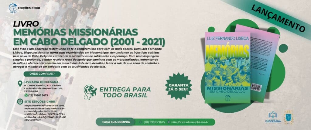 O livro “Memórias Missionárias em Cabo Delgado (2001-2021)” foi publicado pela Edições CNBB. A obra pode ser encontrada na Livraria Diocesana e na Secretaria Paroquial da Paróquia São Pedro Apóstolo (Catedral) em Cachoeiro de Itapemirim.