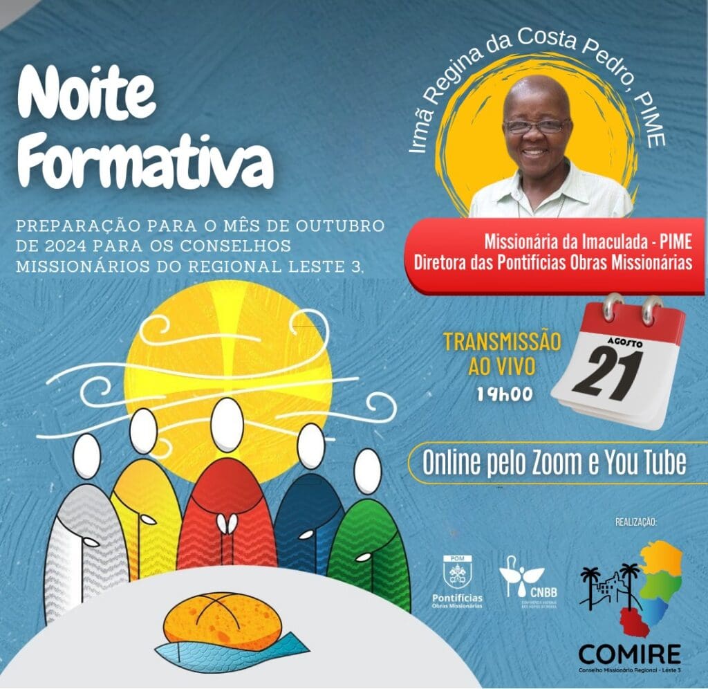 “A preparação dos Conselhos Missionários do Regional Leste 3 da CNBB para o mês de outubro”, esse é o objetivo da Noite Formativa organizada pelo COMIRE – Conselho Missionário Regional. O Bate papo será na quarta-feira, 21 de agosto, às 19h.
