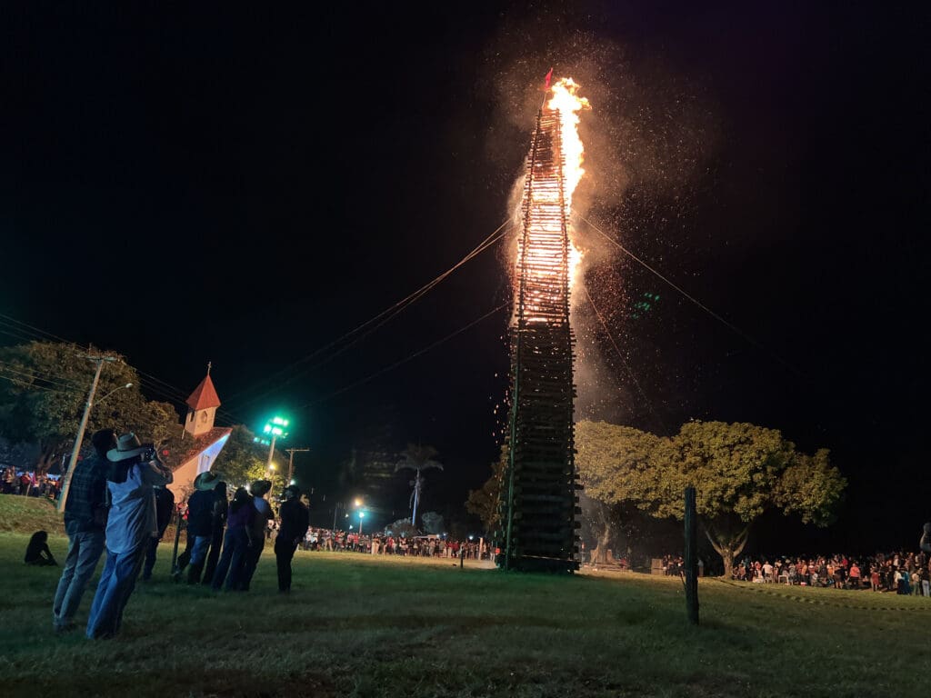 Conforme a organização do evento, para construção da fogueira gigante, os esteios são fincados e amarrados cuidadosamente, “tora por tora, lenha por lenha” até ser erguida com total segurança. Foram 18 toneladas de lenha.